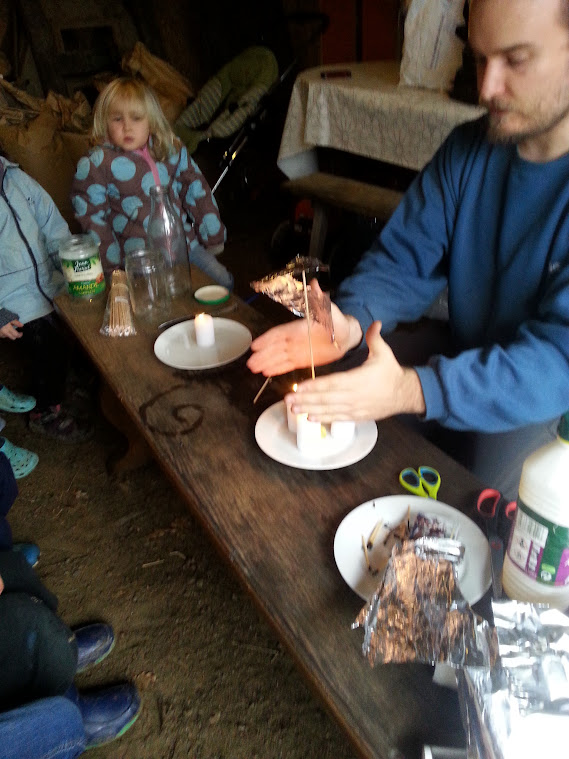 During the workshop, they were able to experiment in ways we wouldn't feel comfortable at home. Their teacher is trained in health and safety and has a lot of experience doing this kind of thing with kids. He had everything necessary to put out the flames if needed as well as the right kind of attitude. They were able to experiment lighting a candle, setting a baton on fire with the flame, what happens when you put a candle in water and cover it, as well as how the hot air above a flame creates movement. And that was just the younger kids. They all came away with some important fire safety rules, the beginnings of an understanding about how fire works and the knowledge that wood can set on fire when it gets very hot even without touching a flame.